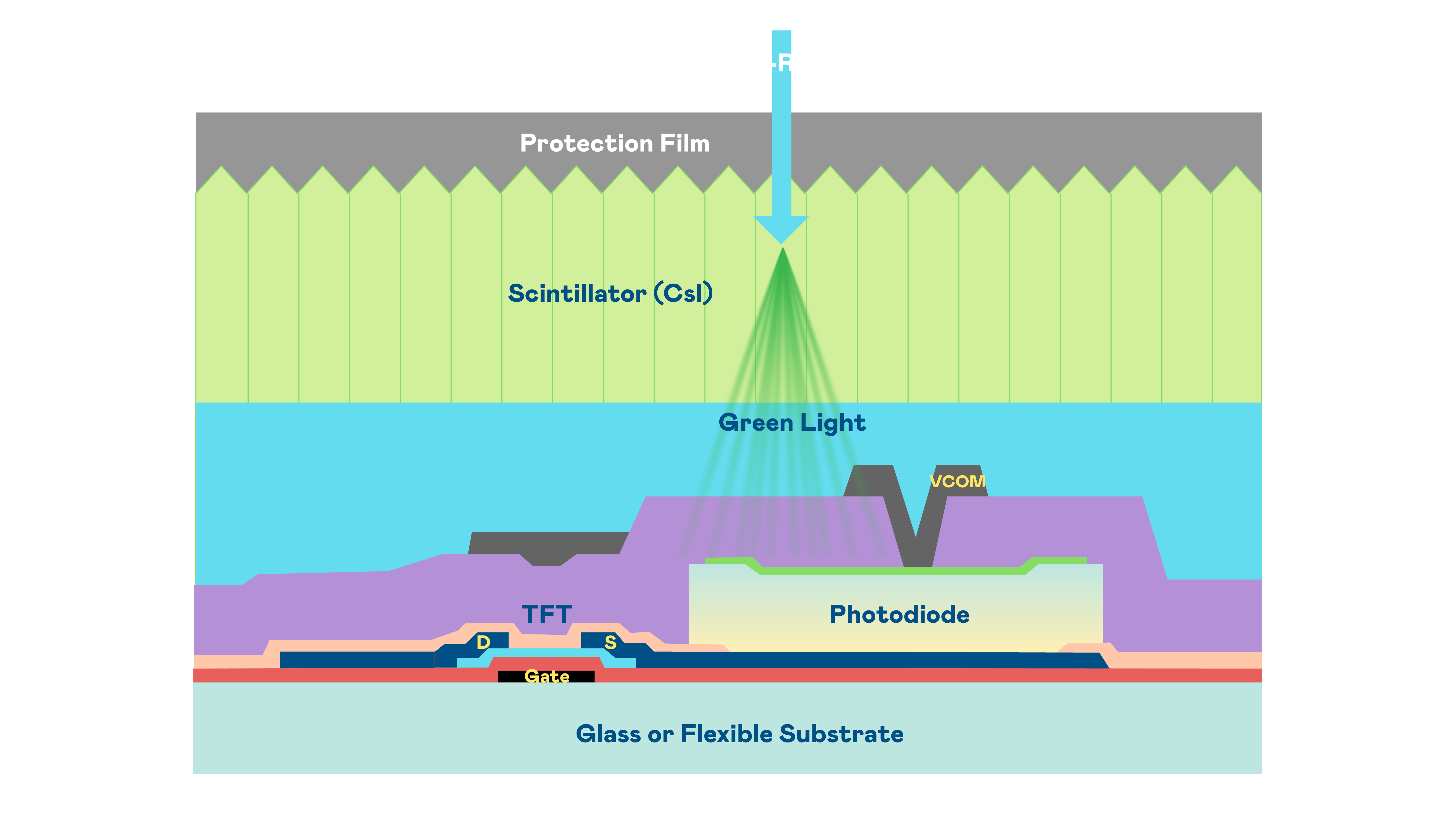 AG百家乐的X光影像感測陣列使用薄膜電晶體 (TFT) 作為每個像素的讀取開關,搭配光電二極體(Photodiode)的光電轉換元件,用以感測X光影像訊號。